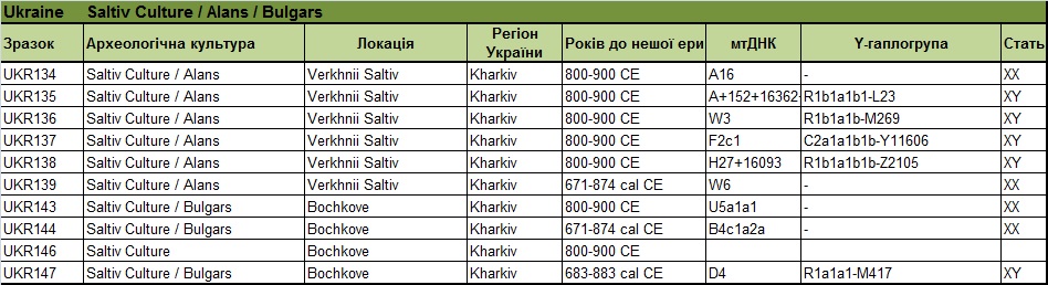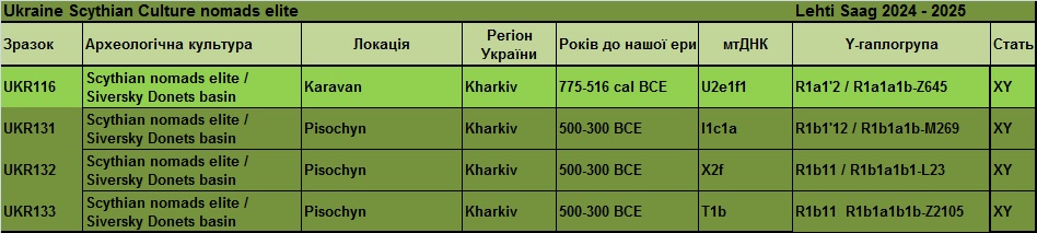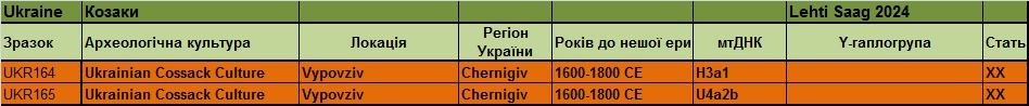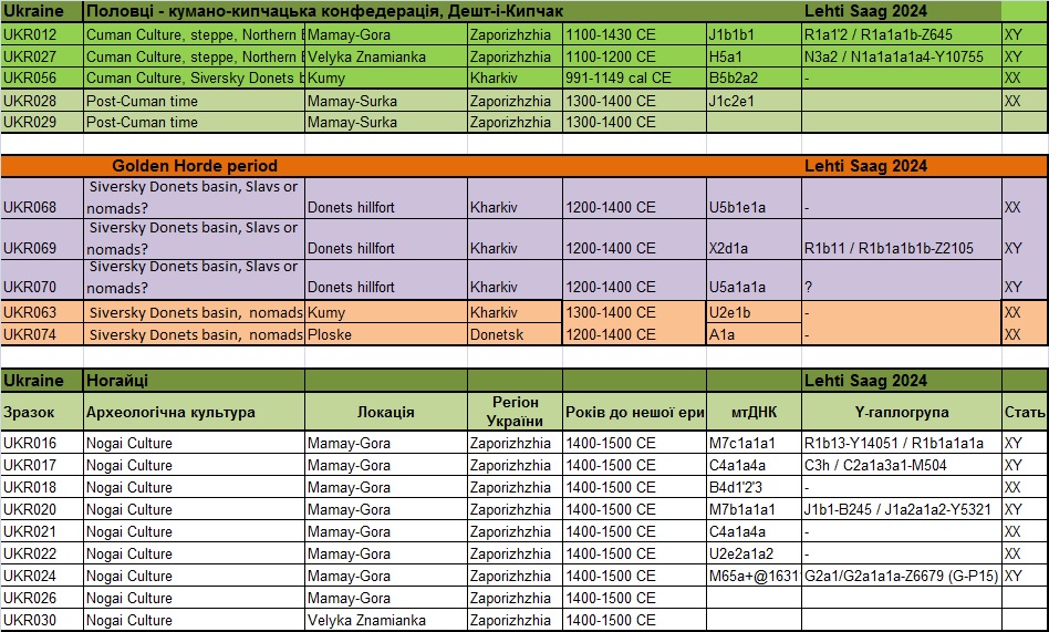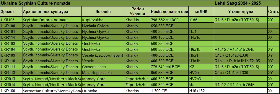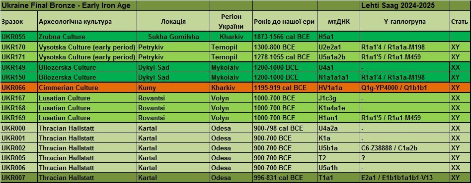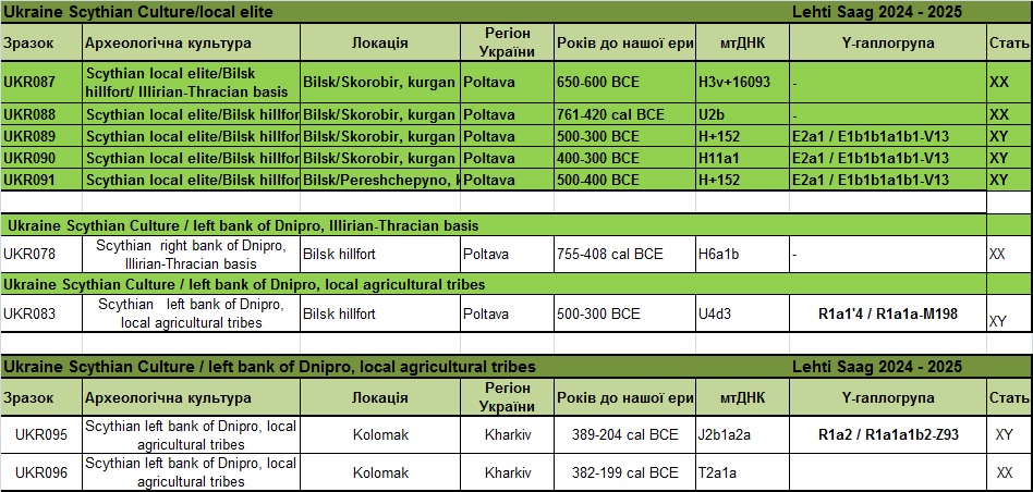 Таблиця – джерело Maciej Chyleński 01.08.2023 р. «Патрилокальність і походження популяцій у Східній і Центральній Європі в епоху середньої бронзи, пов’язане з мисливцями-збирачами»[16]